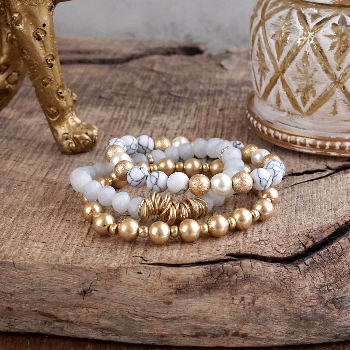 A soft shimmer, a mix of textures, and that easy bohemian spirit — these bracelet sets bring together stone, glass, and metal beads in effortlessly beautiful harmony. Each set of three features a thoughtful mix: worn gold tones, stone, faceted glass, and pearlized finishes that catch the light just right. Perfect for stacking or wearing solo, they add a touch of earthy elegance to any day.