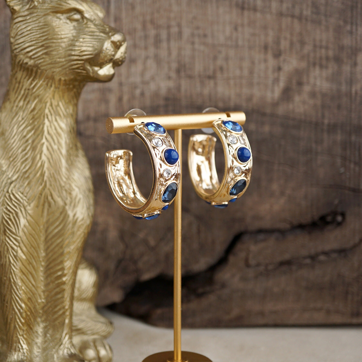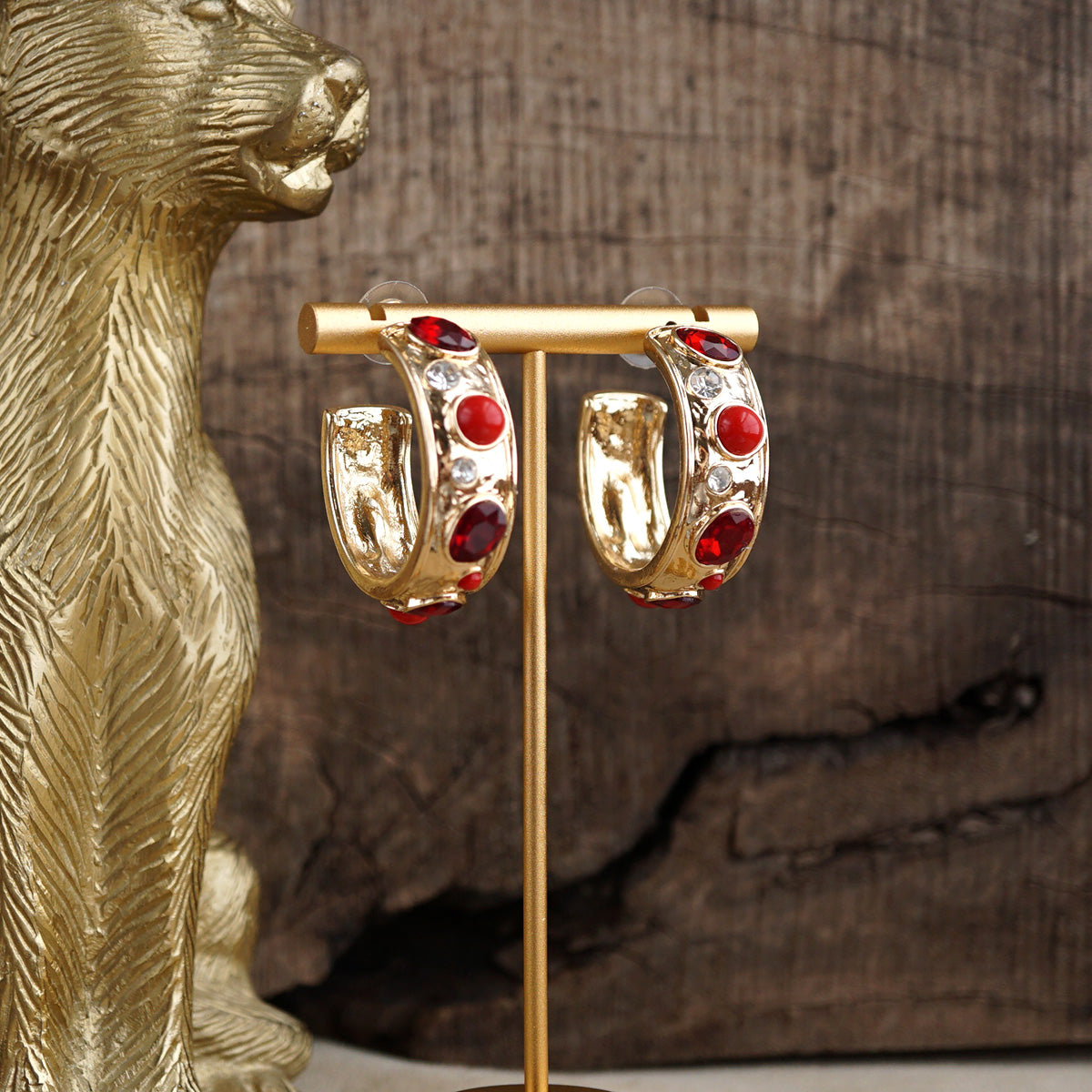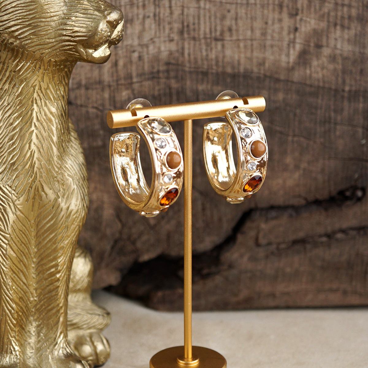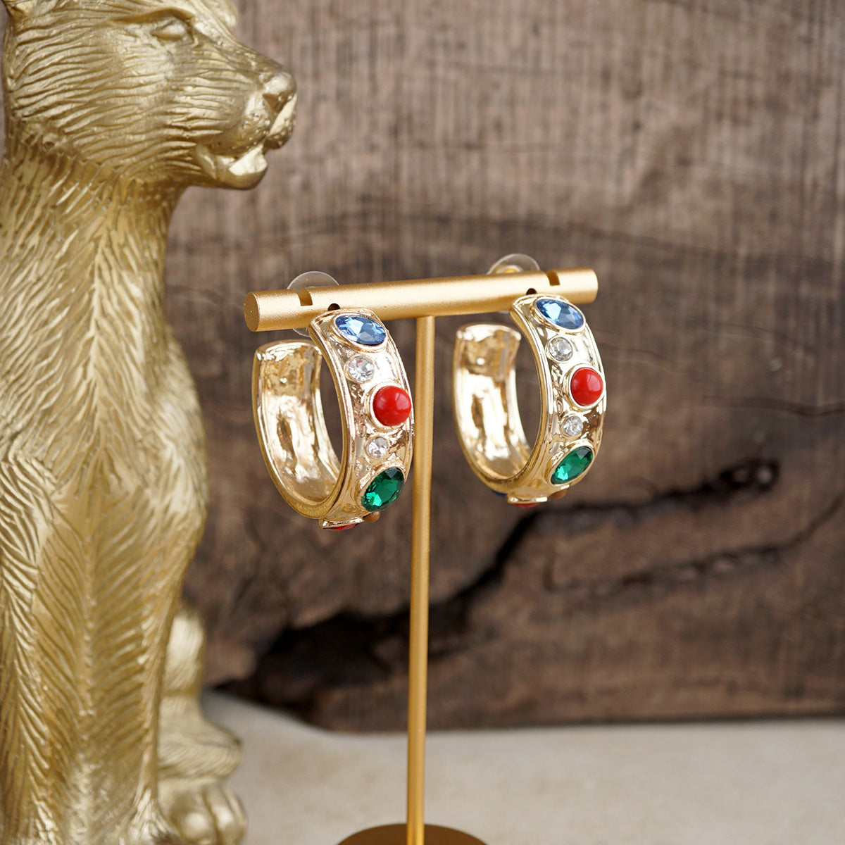 Shimmering with eclectic charm, these jeweled hoops feel like they’ve been plucked from a treasure chest of collected finds. Gold tone hoops with an organic bubble texture catch the light, while faceted glass and cabochon jewels in rich, painterly tones add a pop of color. Whether you reach for deep reds, earthy browns, ocean blues, verdant greens, or a festive holiday mix, each pair carries the kind of artistry that turns everyday dressing into something a little more magical.