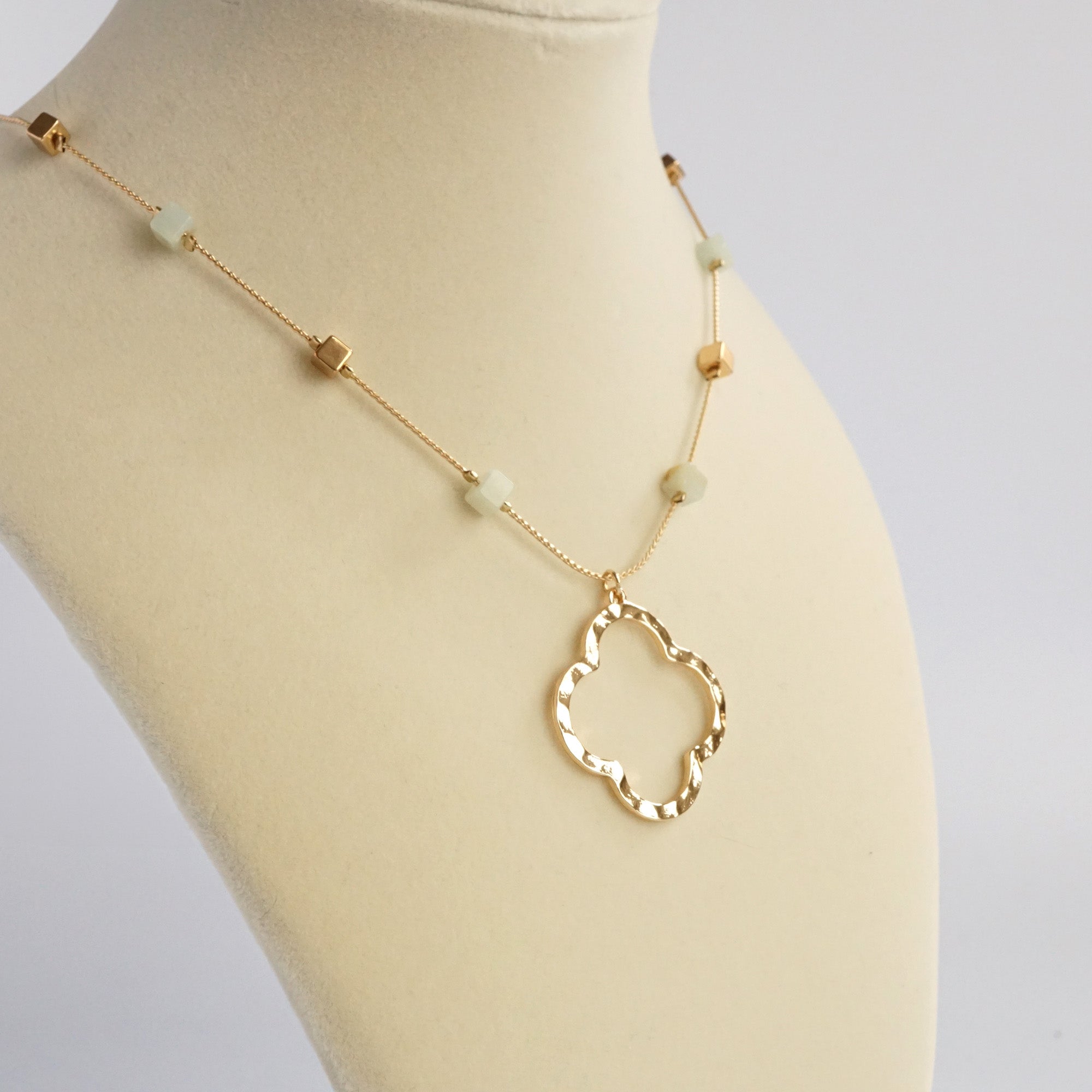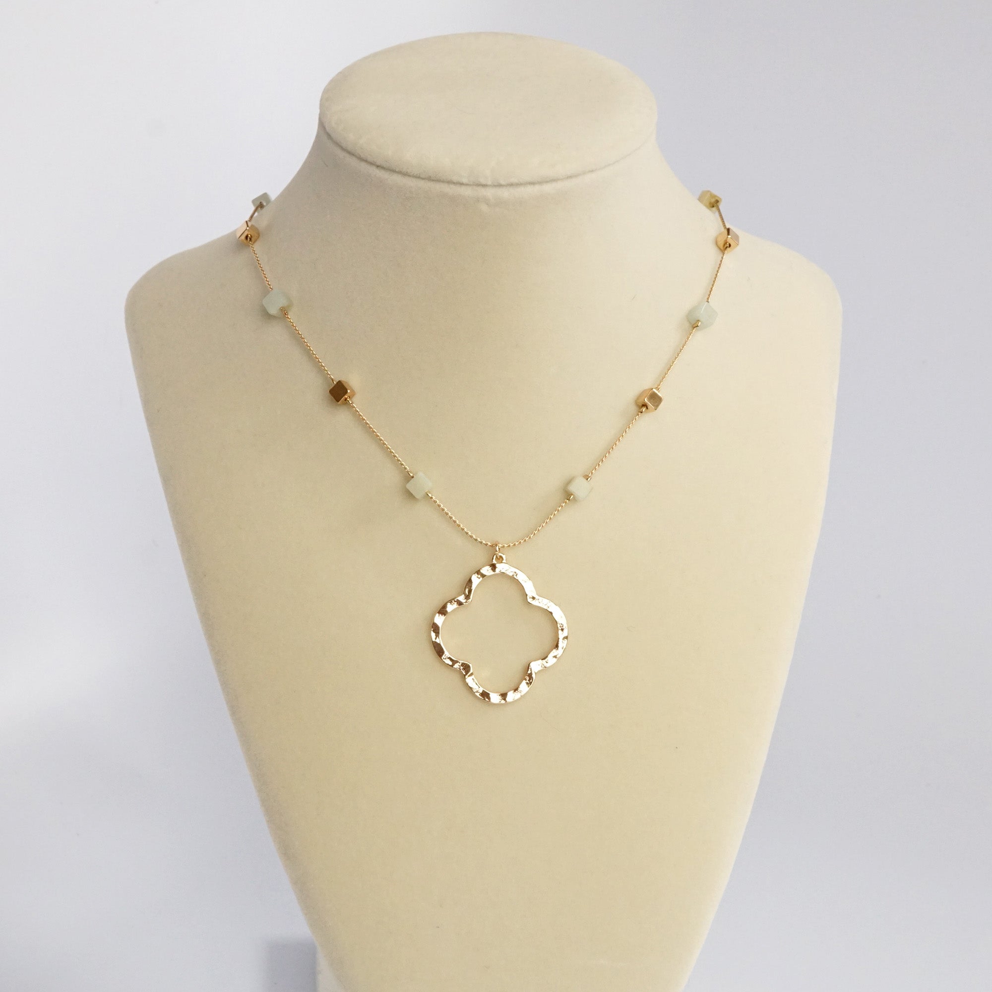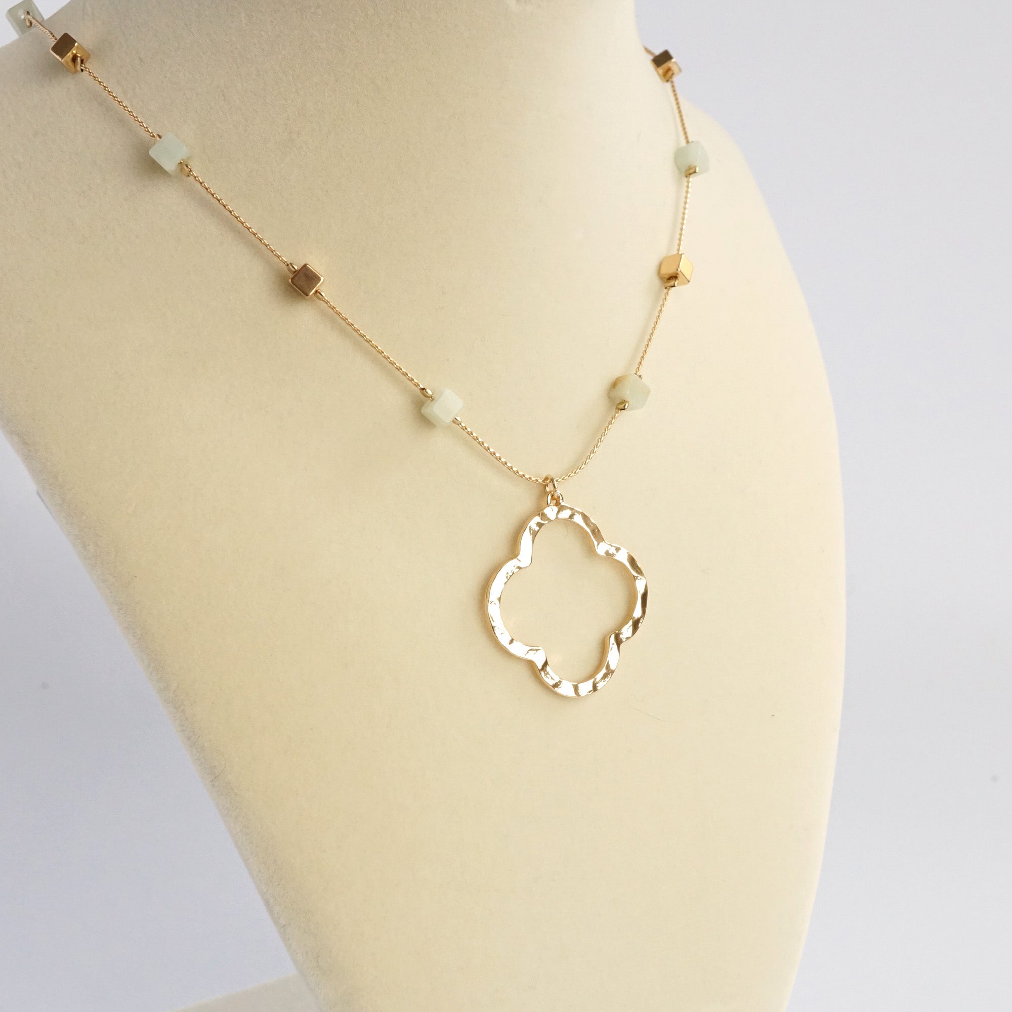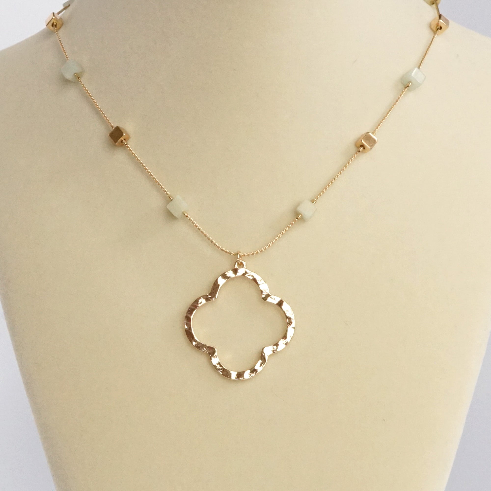 Add a delicate touch with our Clover Pendant Necklace, featuring Amazonite stone dice beads in a Gold tone. This dainty 16" station necklace includes an extender for adjustable fit, and the hammered cutout clover pendant measures 1.25", offering subtle elegance for everyday wear.