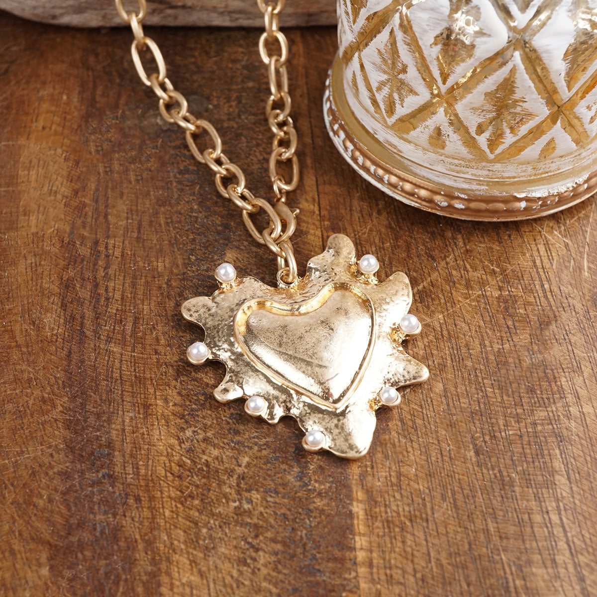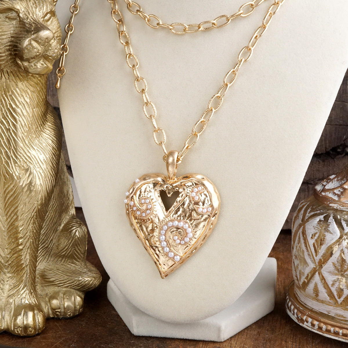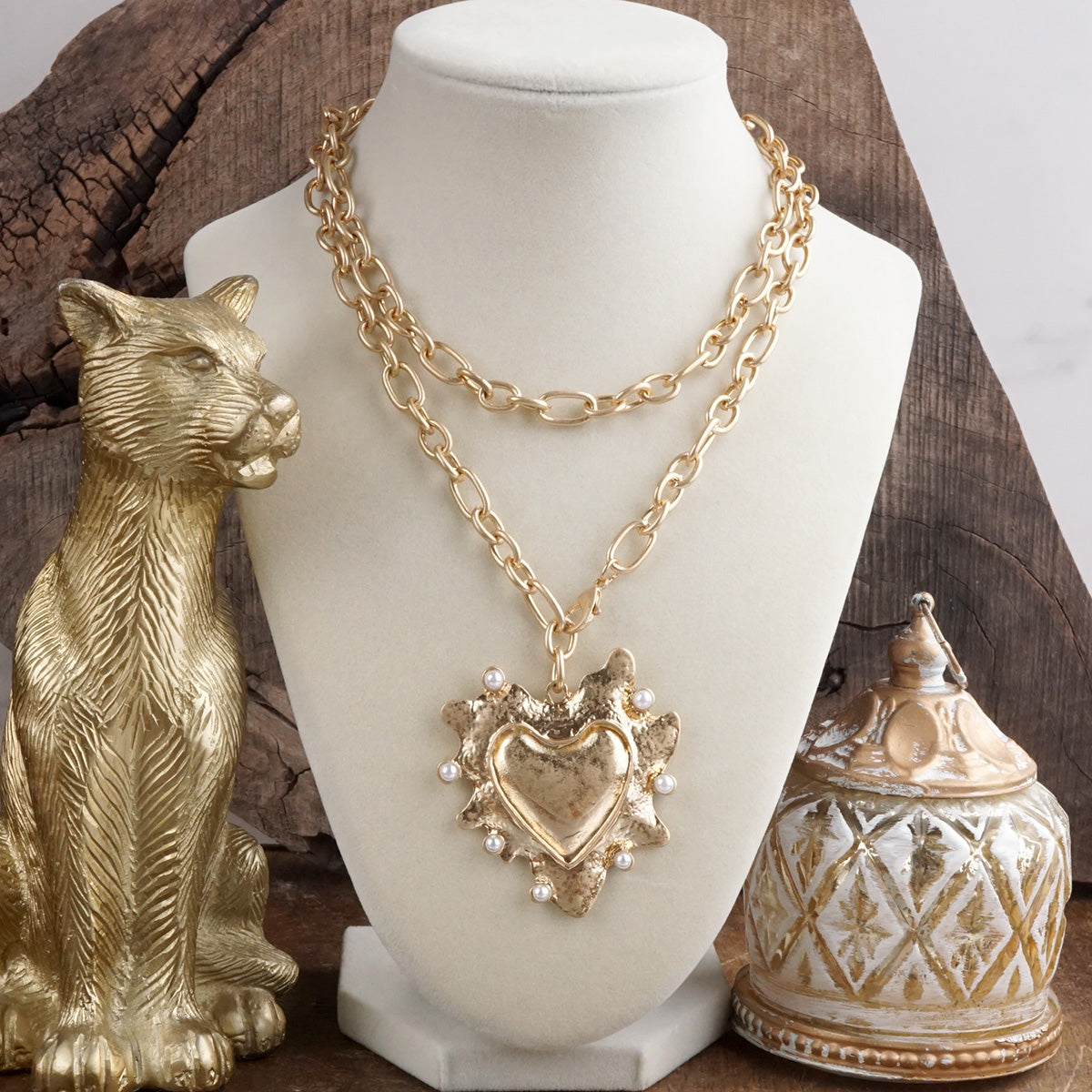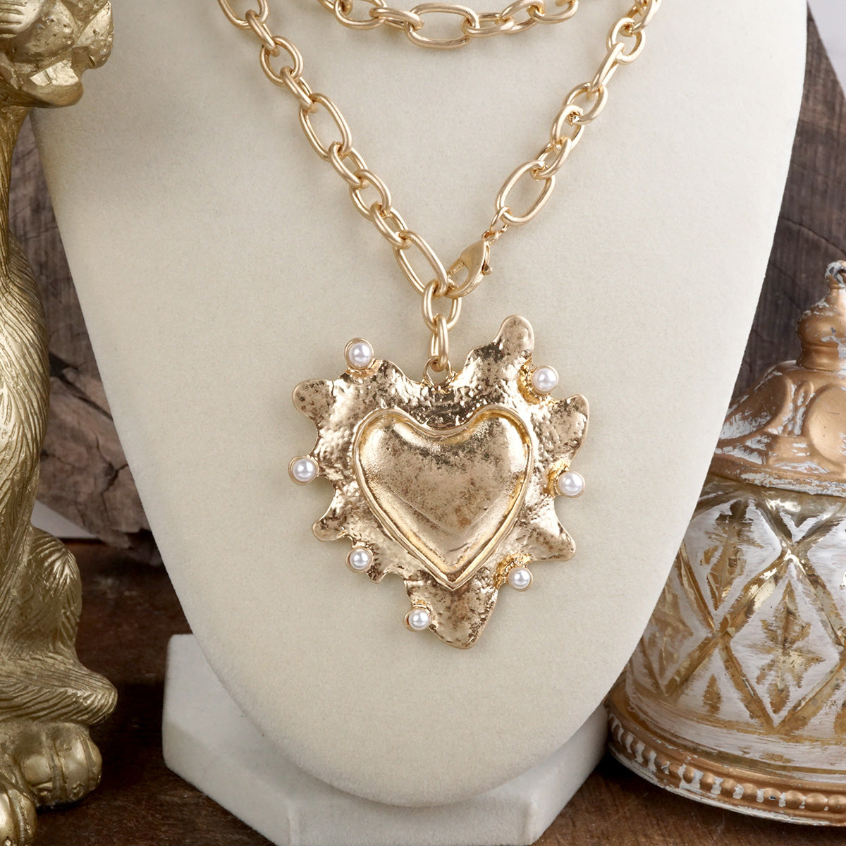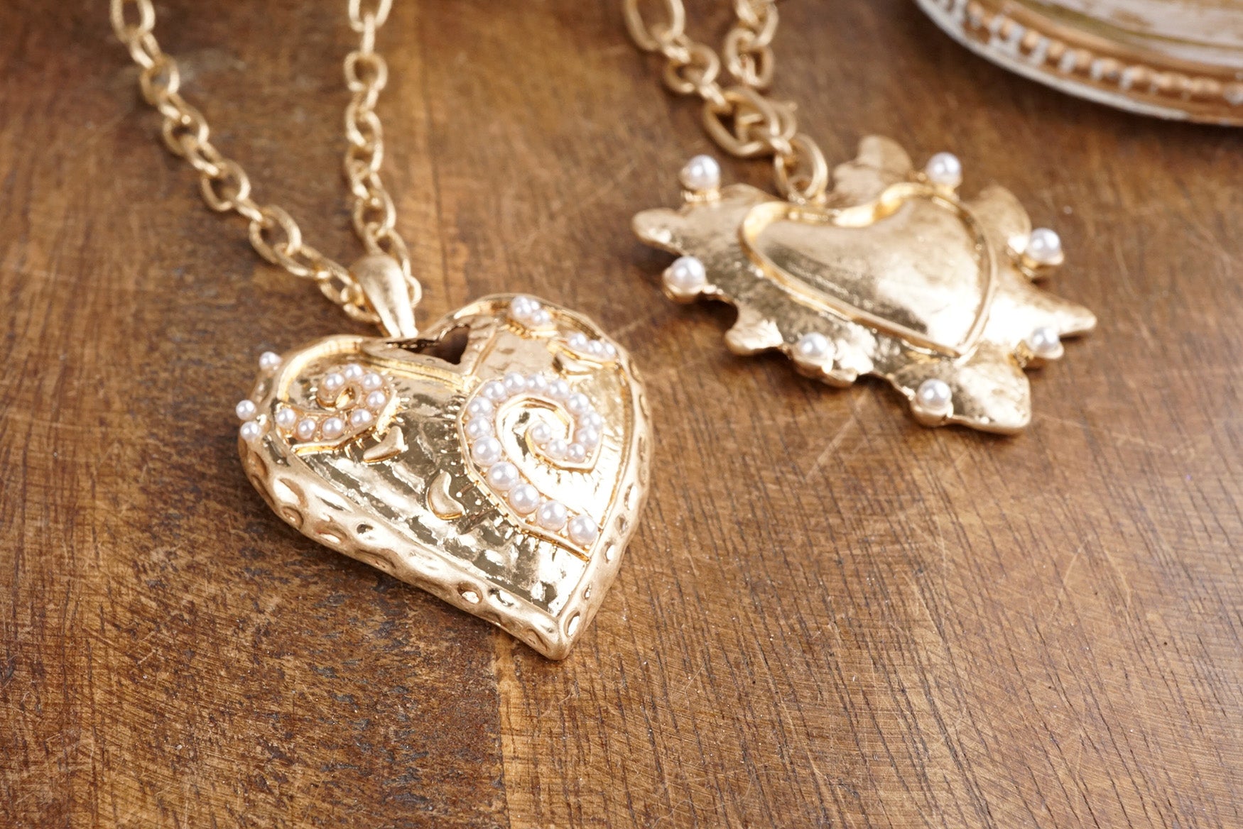 Heartbound Muse – Long Heart Necklace in Gold & Pearls