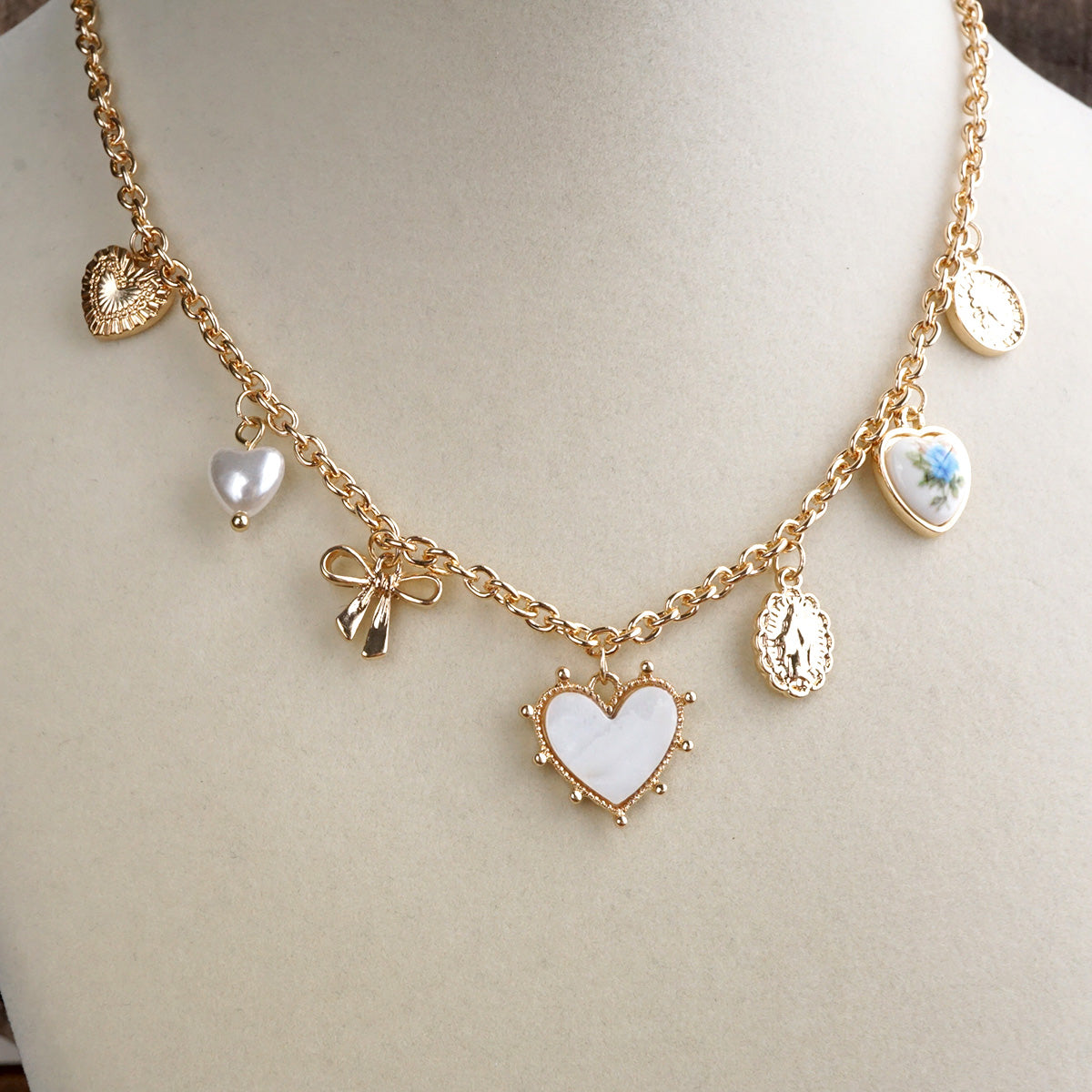 A delicate collection of tiny symbols gathered into one softly expressive strand. This short charm necklace layers sweet heart motifs with playful accents, creating a look that feels personal, lighthearted, and effortlessly styled. Designed to sit just right at the collarbone, it’s an easy favorite for everyday wear with a romantic, collected feel.