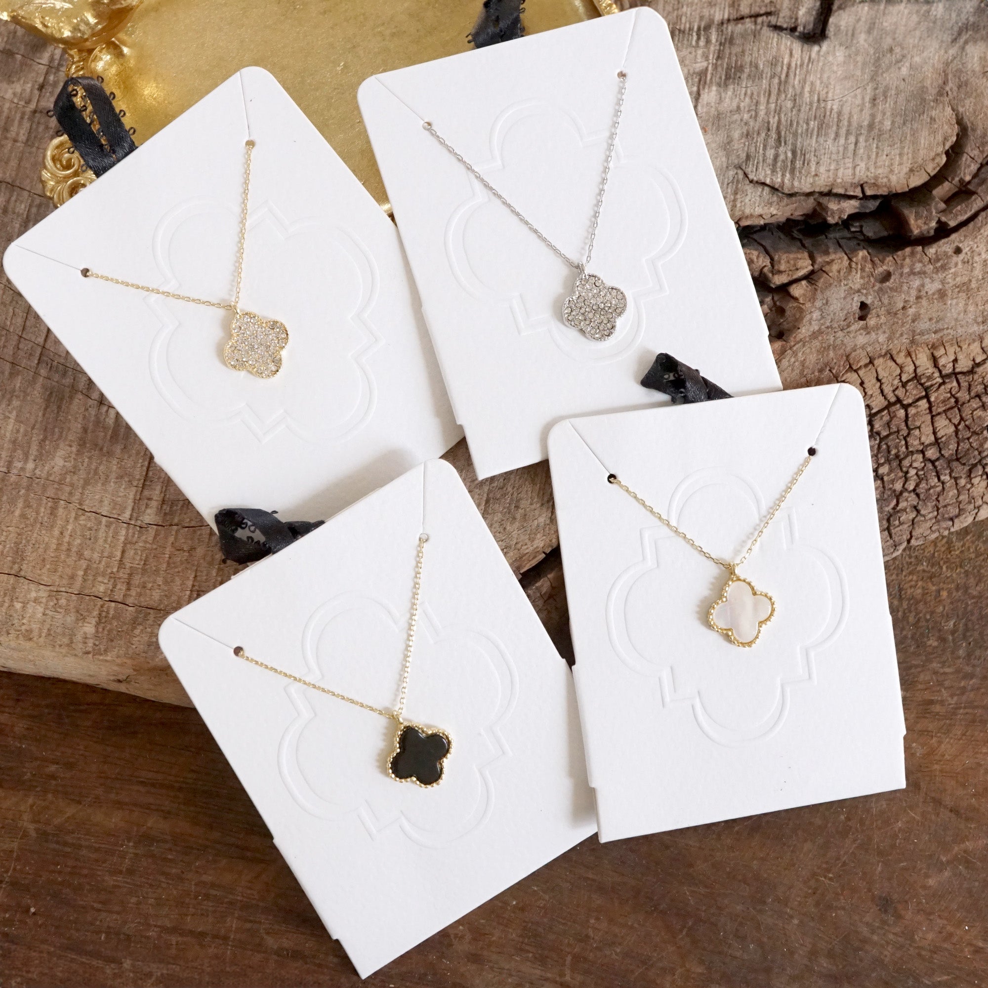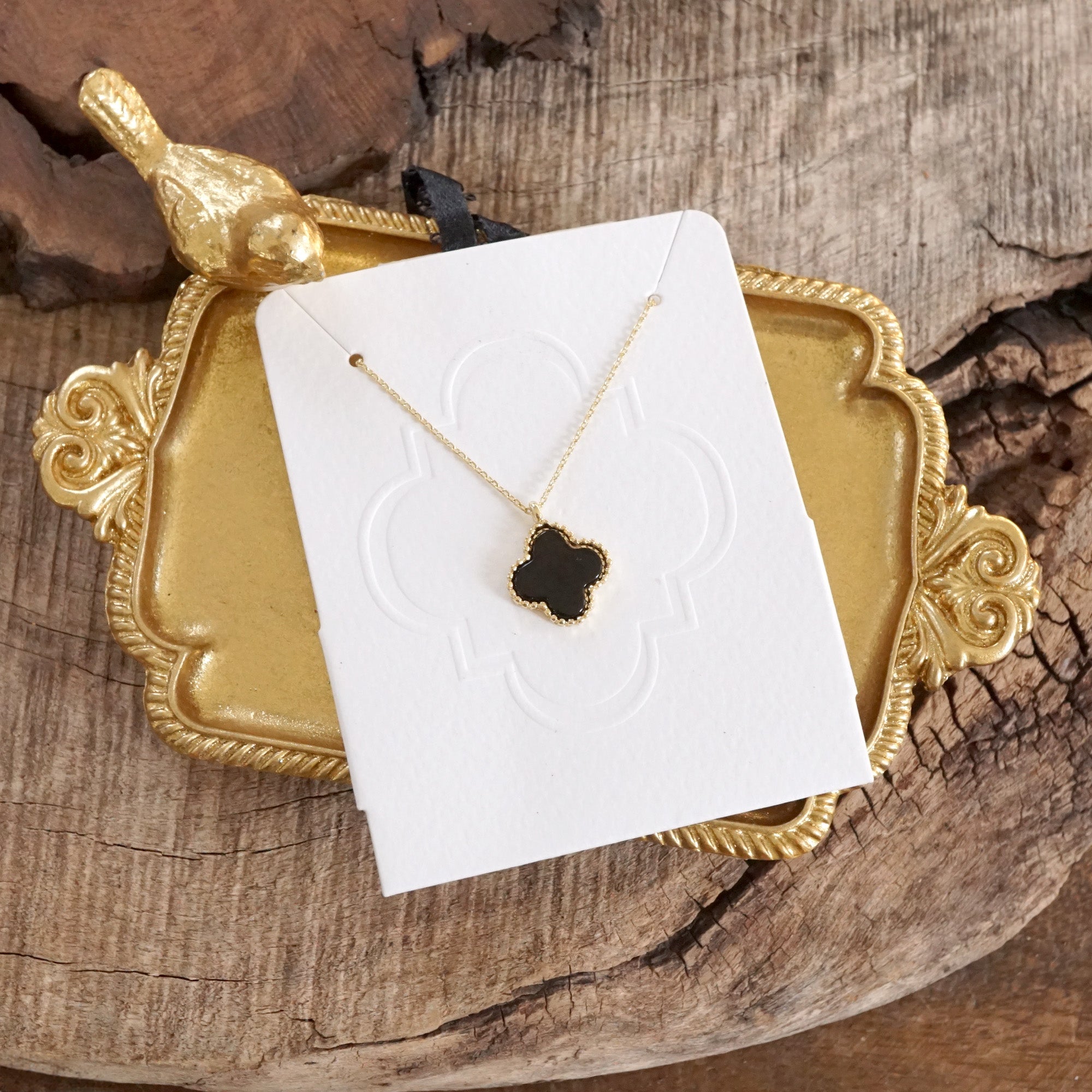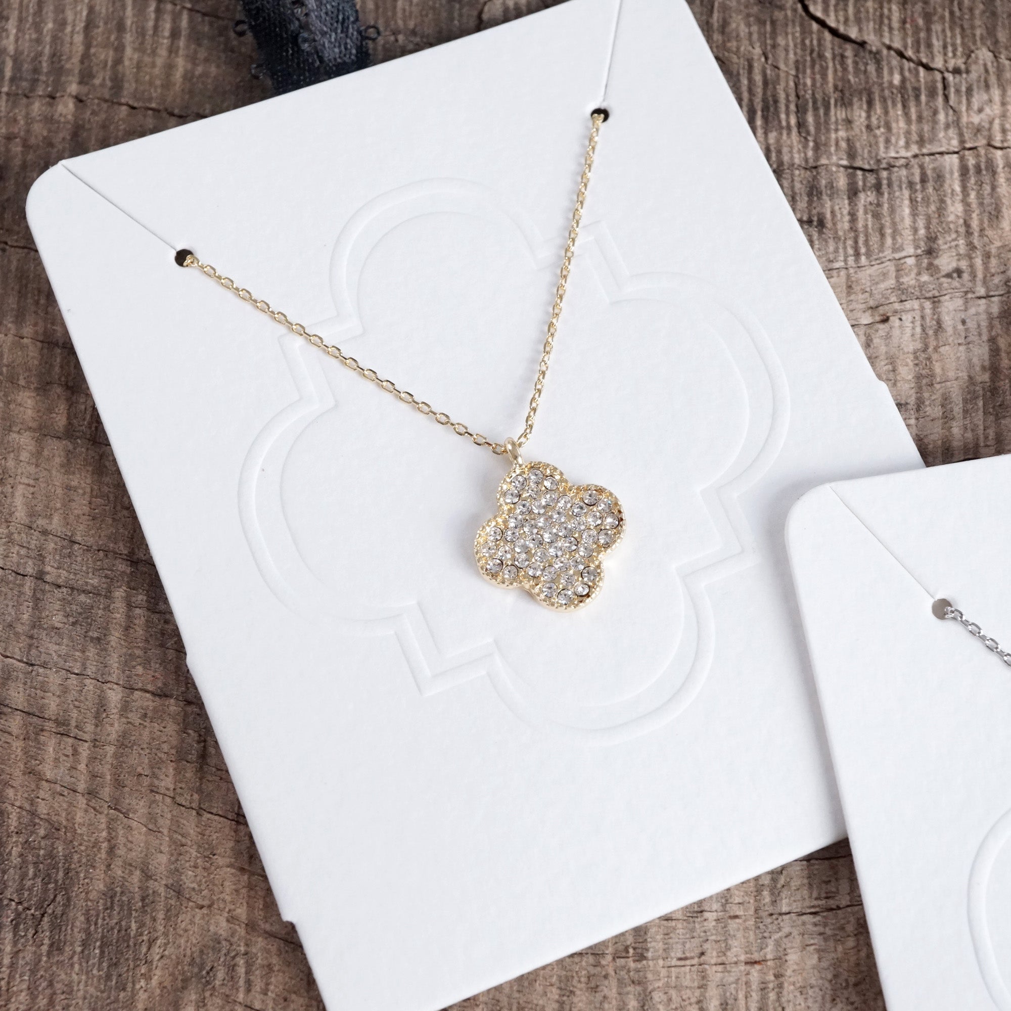 The Short Dainty Clover Gift Necklace is a beautiful and classic piece, perfect for gifting. Featuring a 0.5" clover pendant, it is available in five styles: clear crystals paved, mother-of-pearl, Black - silver, or gold tone finish. Packed in small gift packaging, it's ready to be gifted.