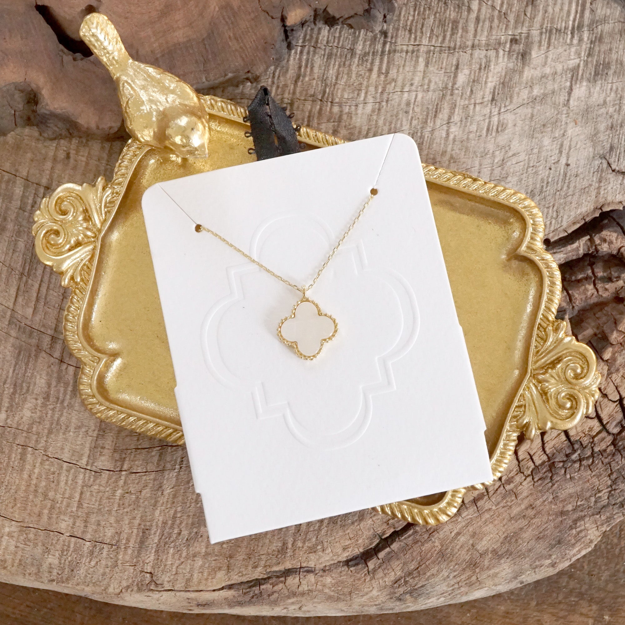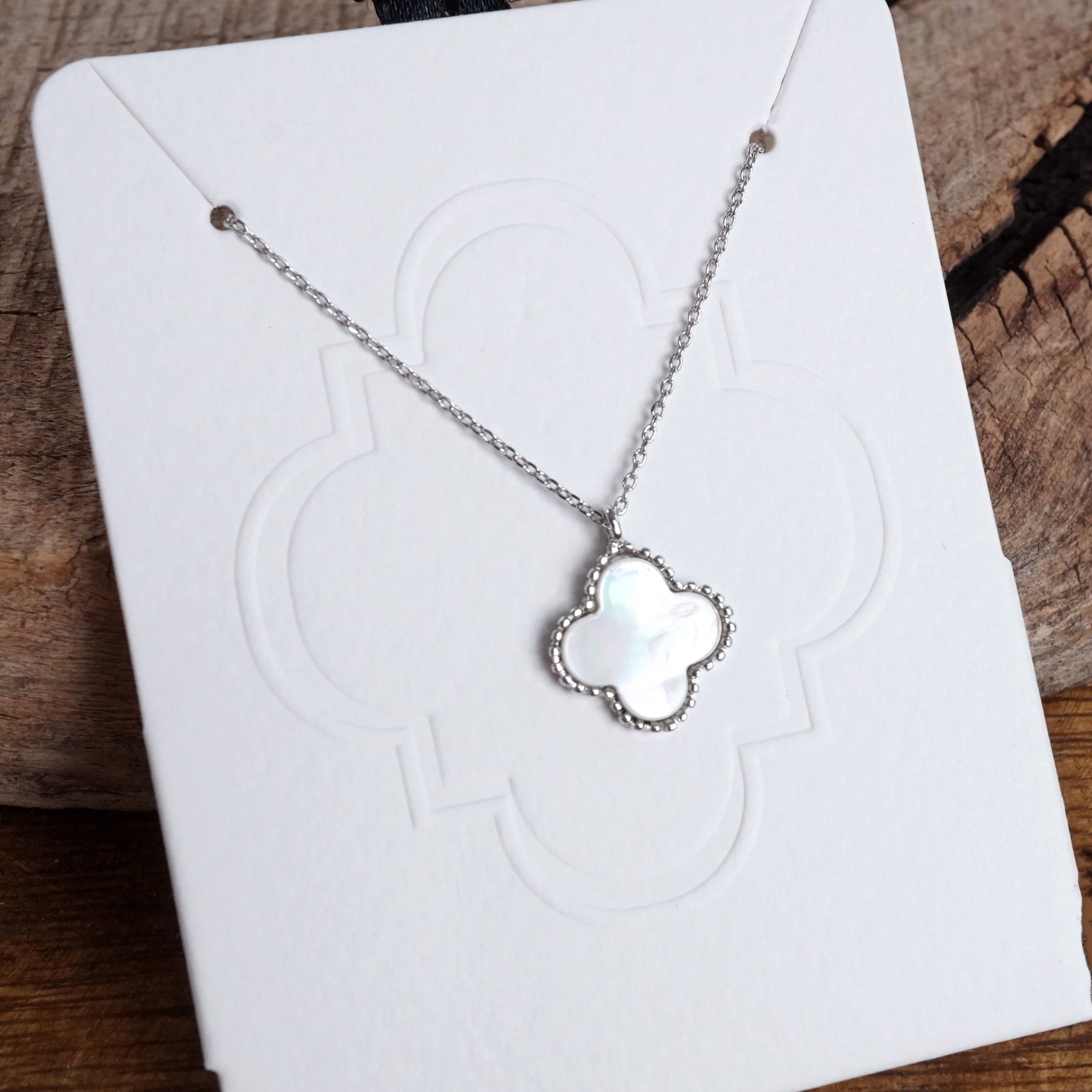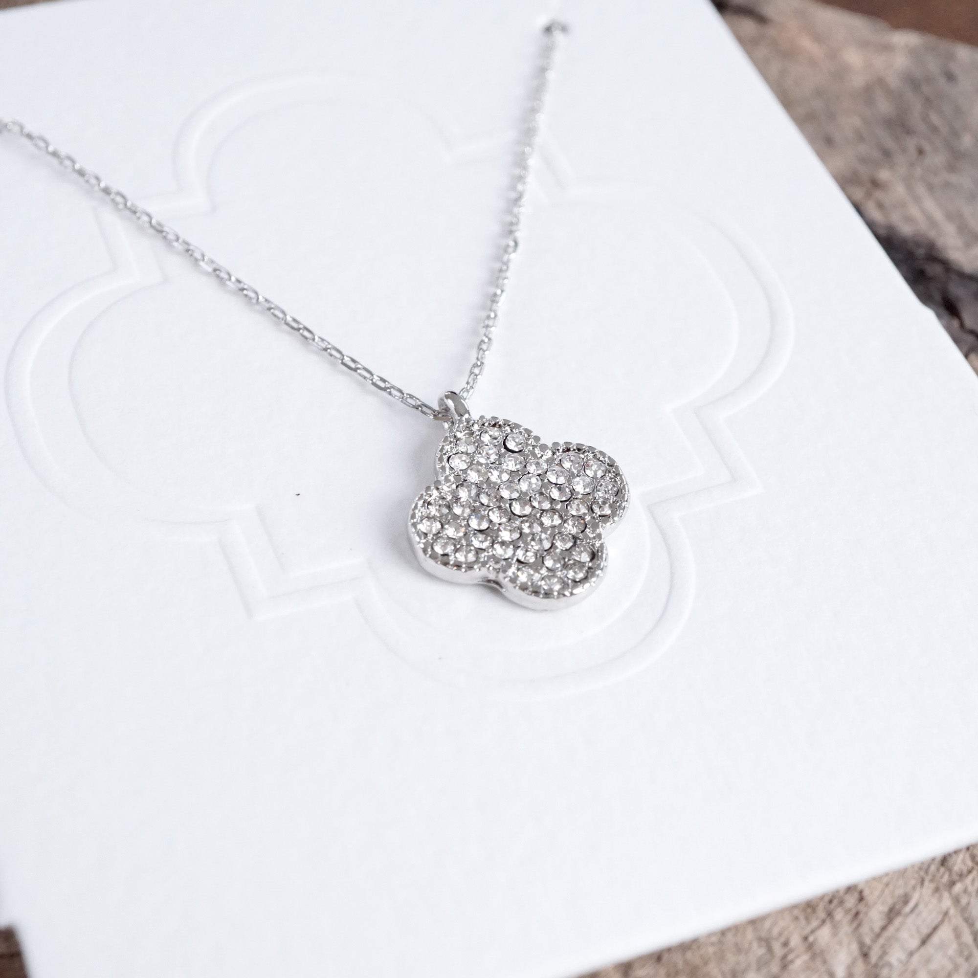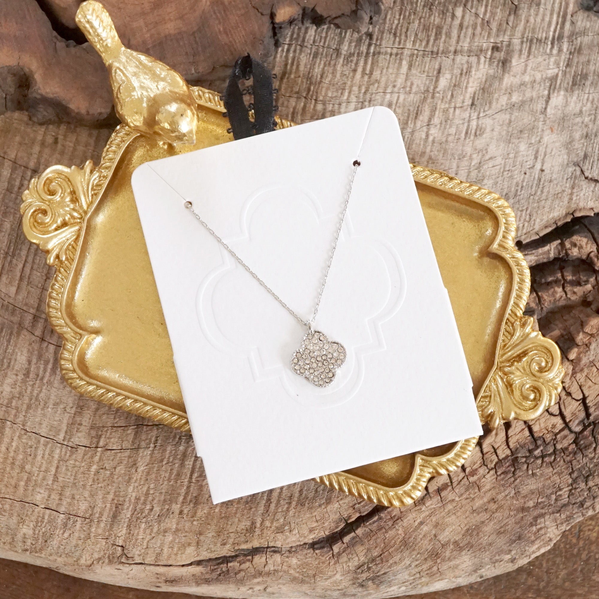 The Short Dainty Clover Gift Necklace is a beautiful and classic piece, perfect for gifting. Featuring a 0.5" clover pendant, it is available in five styles: clear crystals paved, mother-of-pearl, Black - silver, or gold tone finish. Packed in small gift packaging, it's ready to be gifted.