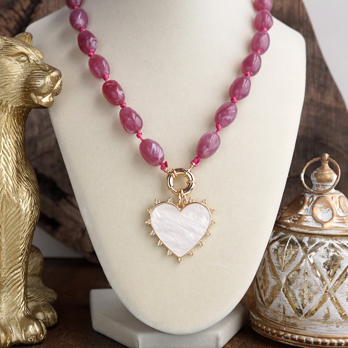 Rich in color and story, this heart pendant necklace weaves together organic acrylic beads and a golden accent that feels both soulful and artful. Each bead is hand-knotted on soft thread, creating a beautiful drape and effortless flow. A clasp-like ring holds a heart pendant lined with luminous synthetic mother-of-pearl for just the right touch of romance. Perfect for layering or wearing on its own.