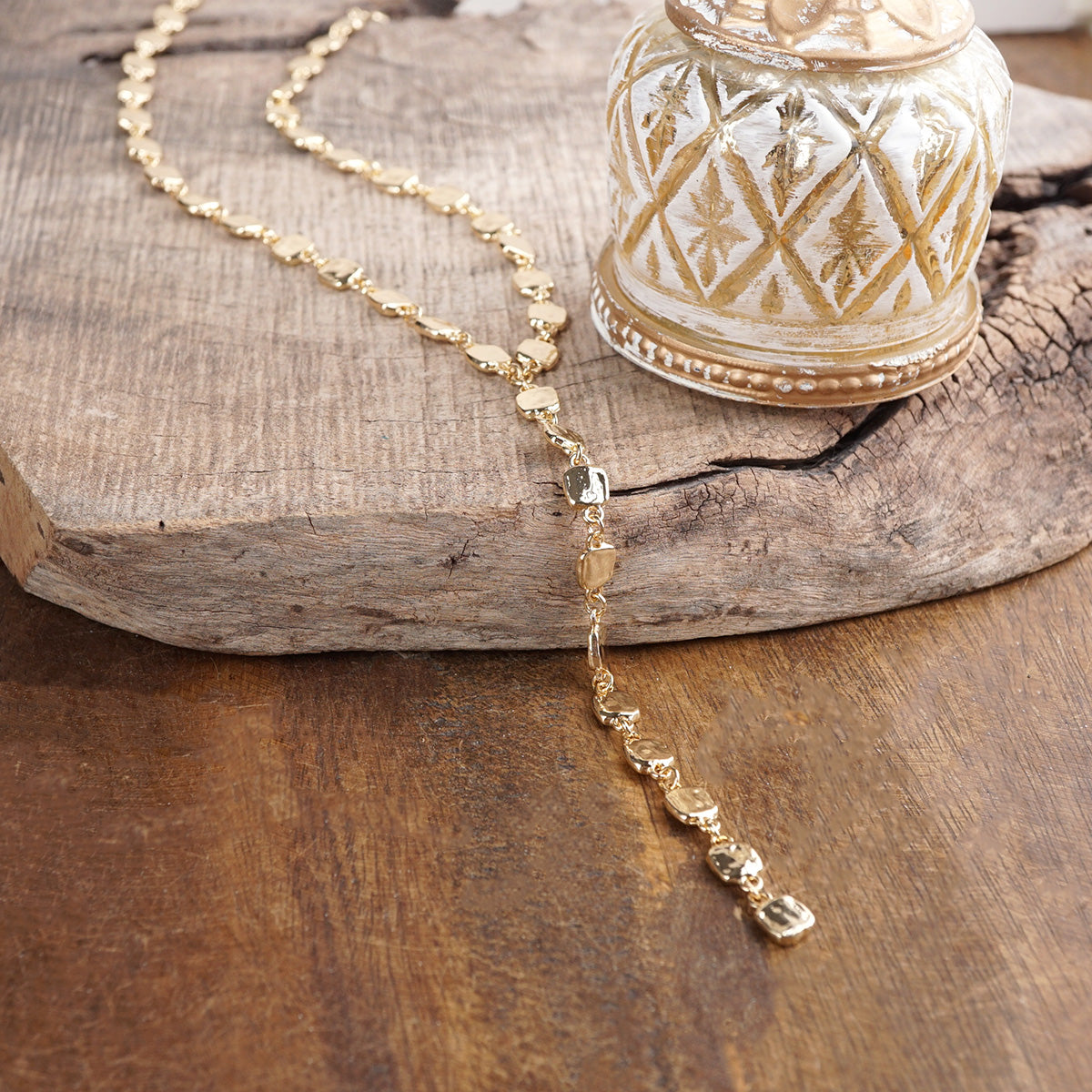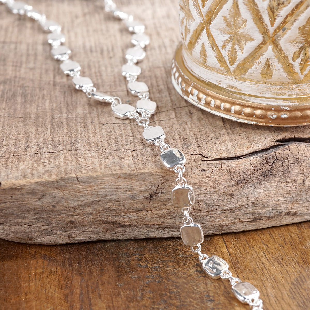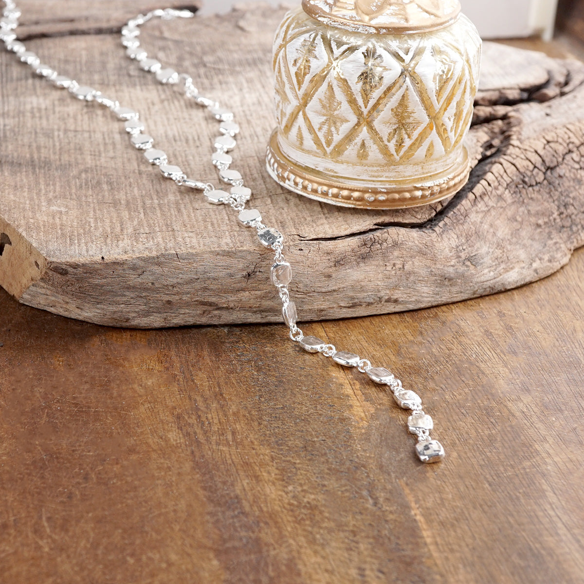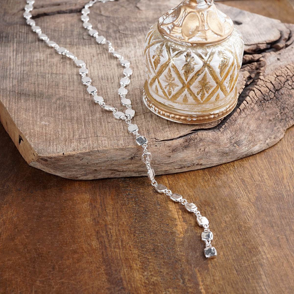 A fluid line of softly hammered squares flows into a striking lariat drop that moves with natural rhythm and shine. Each organic link reflects light differently, creating depth, glow, and sculptural dimension.