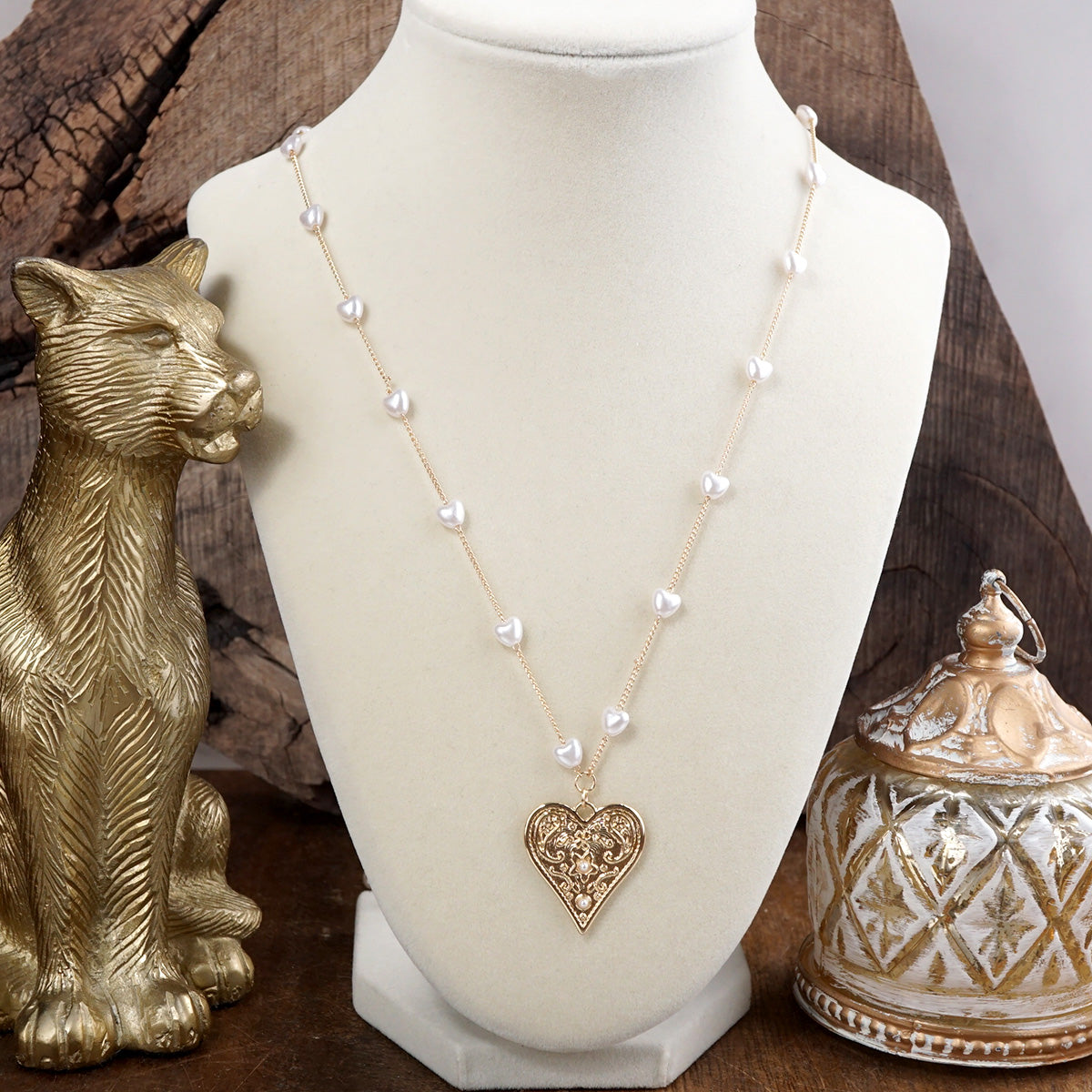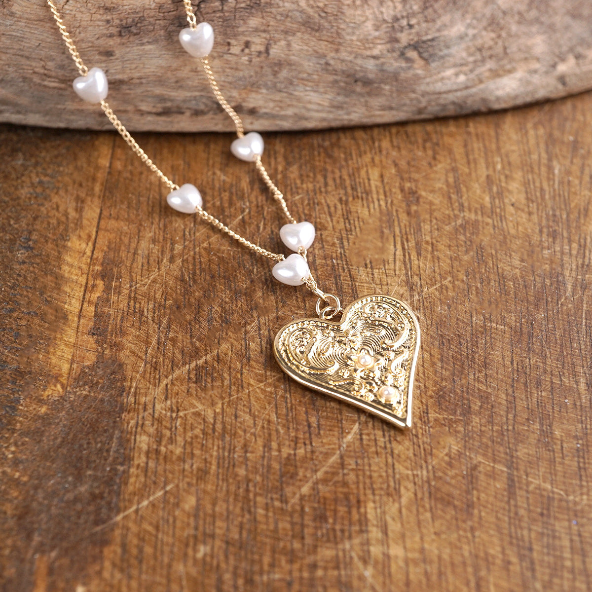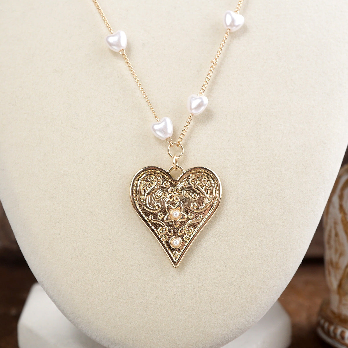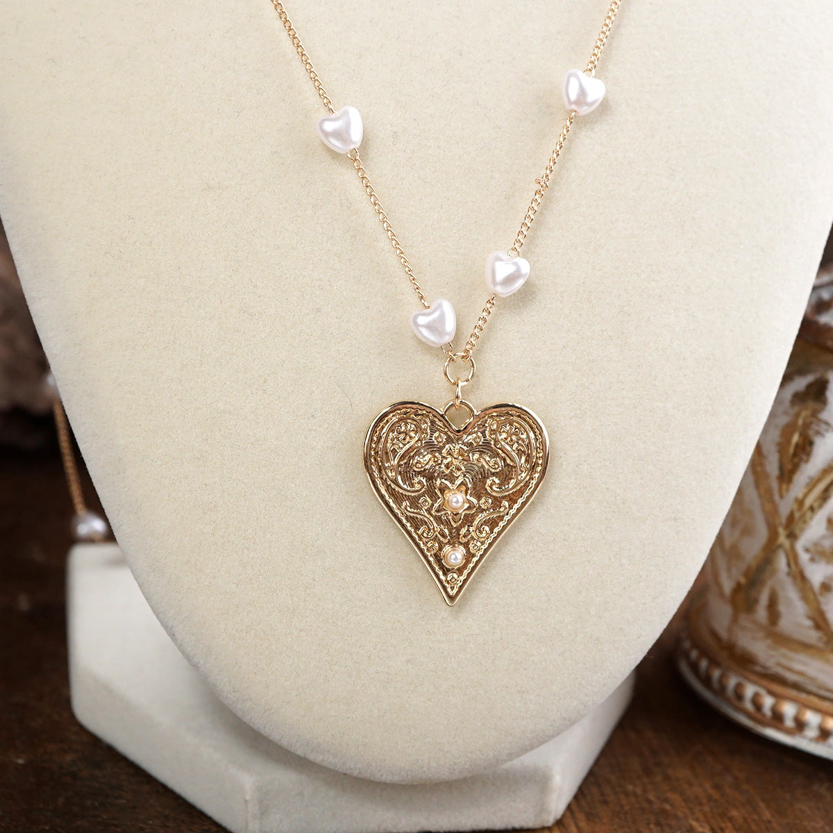 A delicate rhythm of soft pearlized hearts flows along a fine gold-tone chain, leading to an ornate heart pendant that feels vintage-inspired and full of charm.