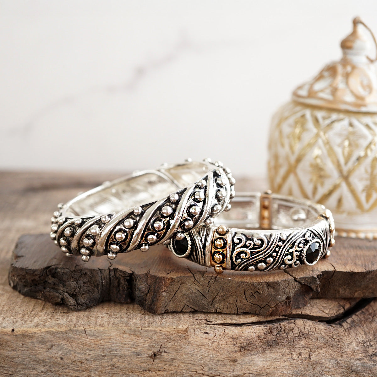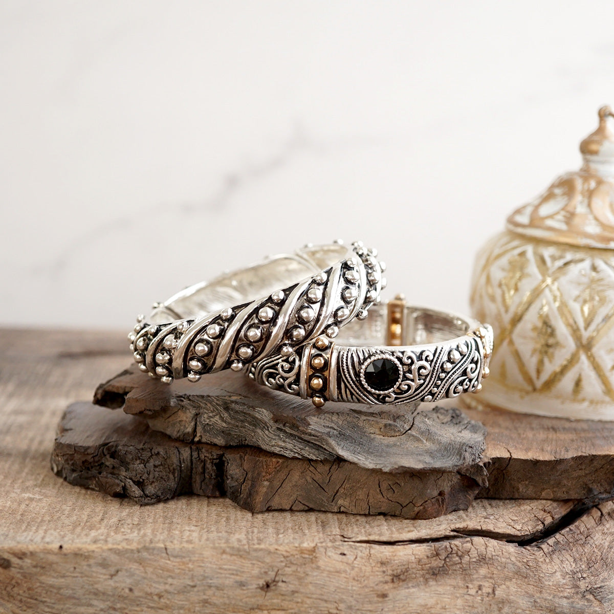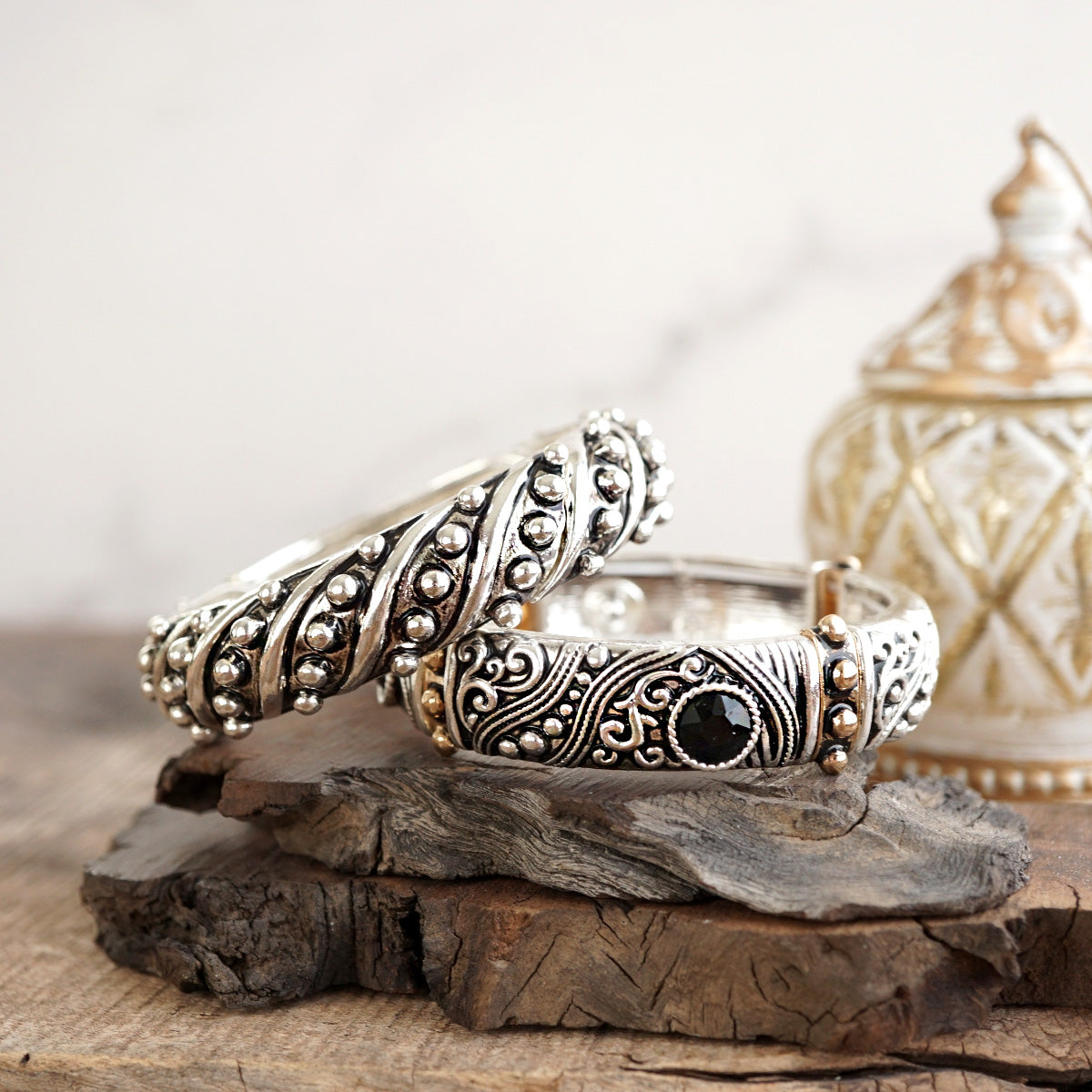 Textured and full of spirit, these worn silver bangles bring a touch of rugged artistry to any stack. Choose between two sculptural styles — a filigree design inset with black glass crystal and golden accents, or a twisted stripe-and-bubble motif that catches the light just right. Effortless to slip on and endlessly layerable.