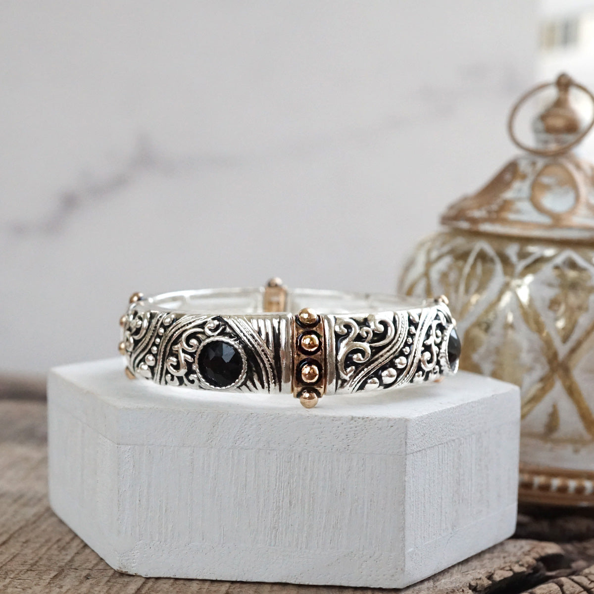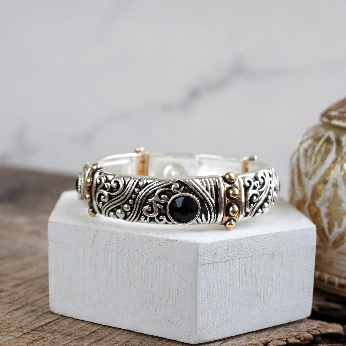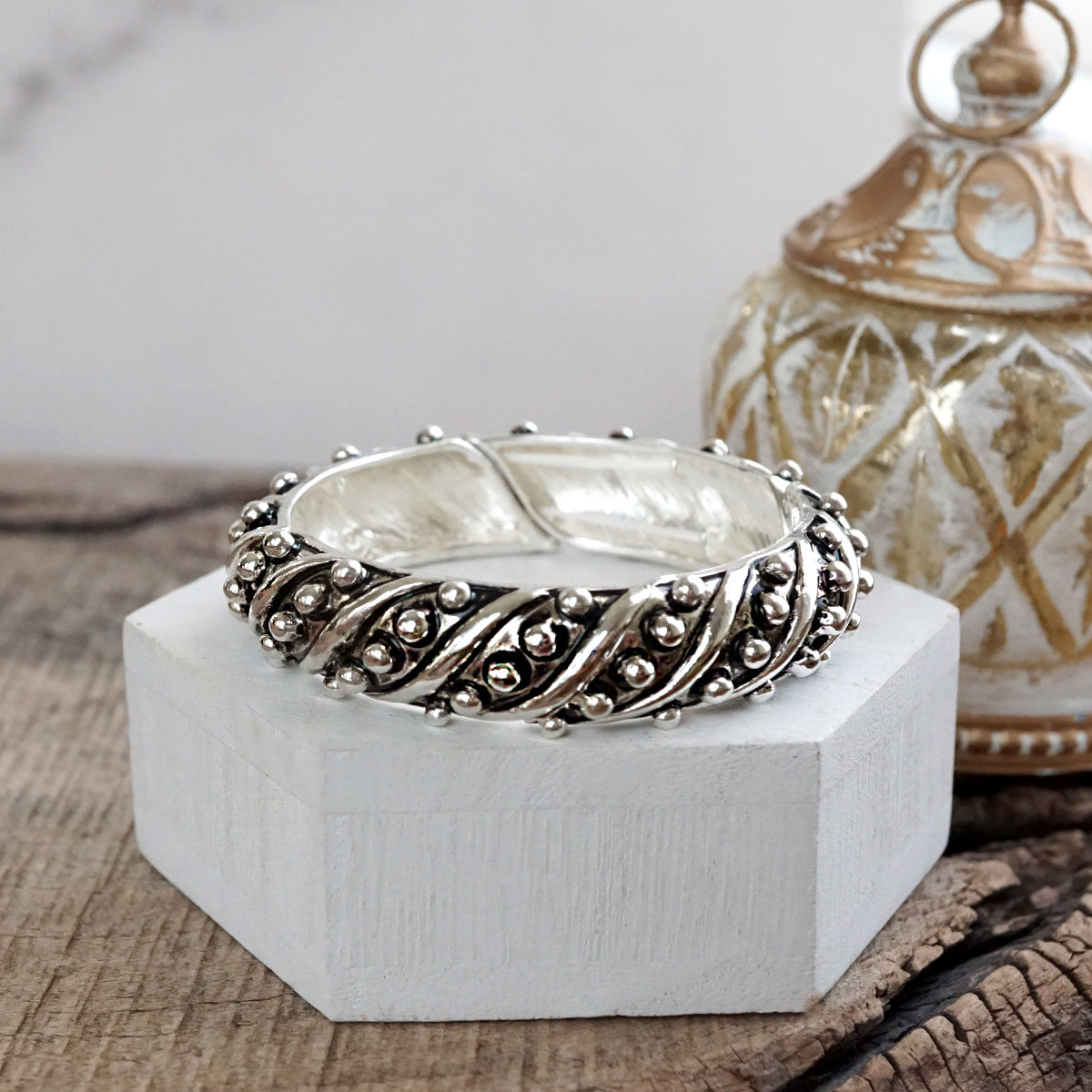 Textured and full of spirit, these worn silver bangles bring a touch of rugged artistry to any stack. Choose between two sculptural styles — a filigree design inset with black glass crystal and golden accents, or a twisted stripe-and-bubble motif that catches the light just right. Effortless to slip on and endlessly layerable.