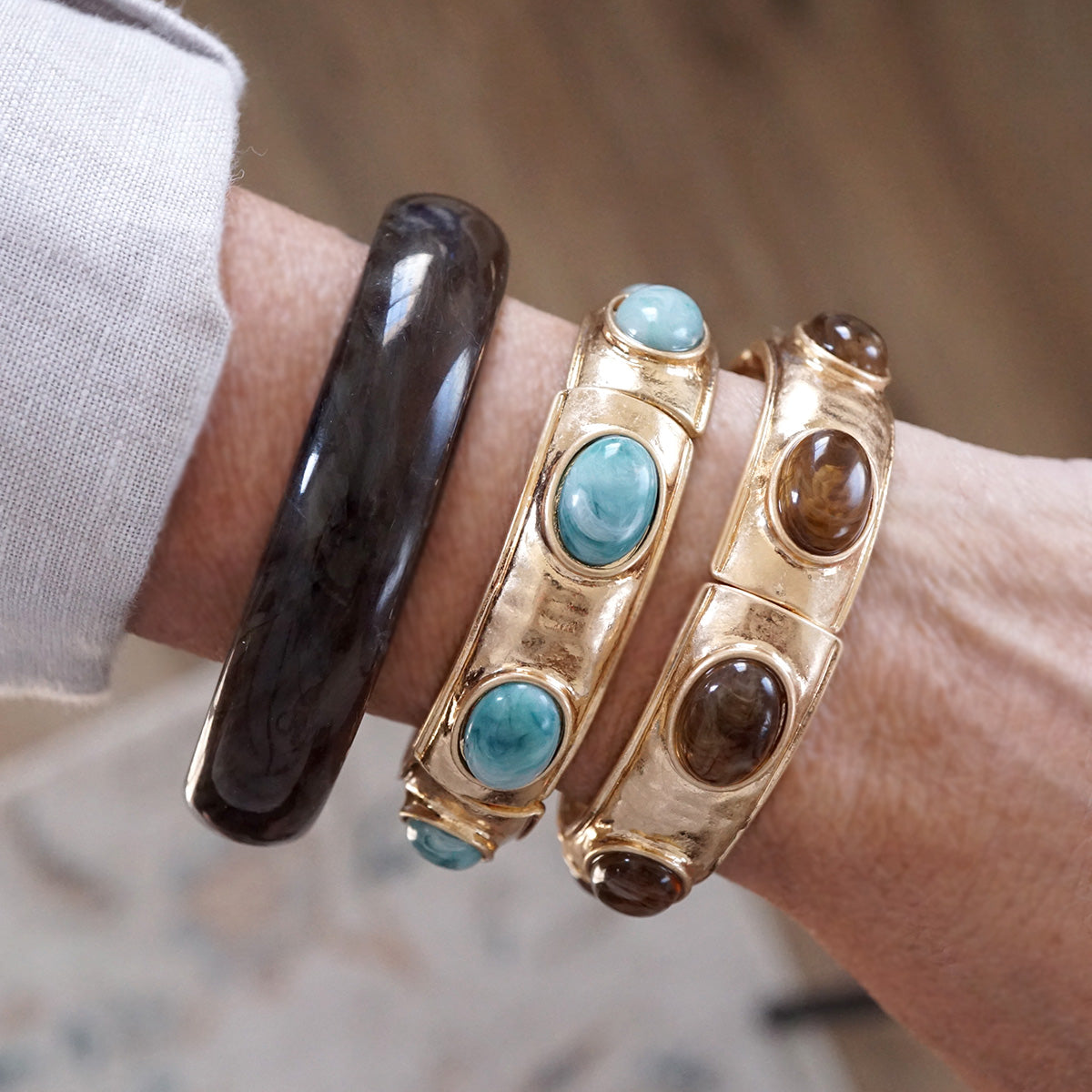 A bold yet wearable beauty, this golden bangle brings a touch of artisan charm to any look. Hammered metal and cozy tones meet in a stretchy, easy-to-style design — each oval acrylic cabochon catching light with a soft, vintage-inspired glow. Whether worn solo or stacked high, it’s the kind of statement that feels timeless and beautifully undone.